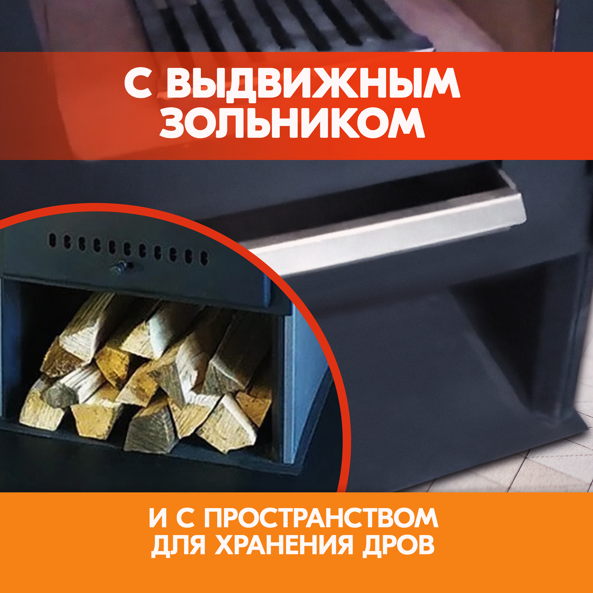 Под топкой имеется небольшое пространство для хранения и просушки дров.